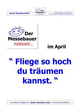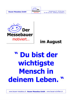 Der Motivations Slogan der Hauser Messebau aus Binningen. Möchten Sie auch jeden Monat so einen Spruch zum ausdrucken für an Ihre Pinnwand oder sonst gut sichtbar? Einfach bei uns den Newsletter anmelden unter: